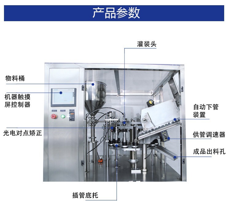 1.適用于醫(yī)藥、食品、化妝品、日用化工等行業(yè),對復合管,塑料管,鋁管進行灌裝封尾??蓪⒏鞣N糊狀、膏狀、粘度流體等物料順利準確地注入軟管中,并完成封尾和打批號、