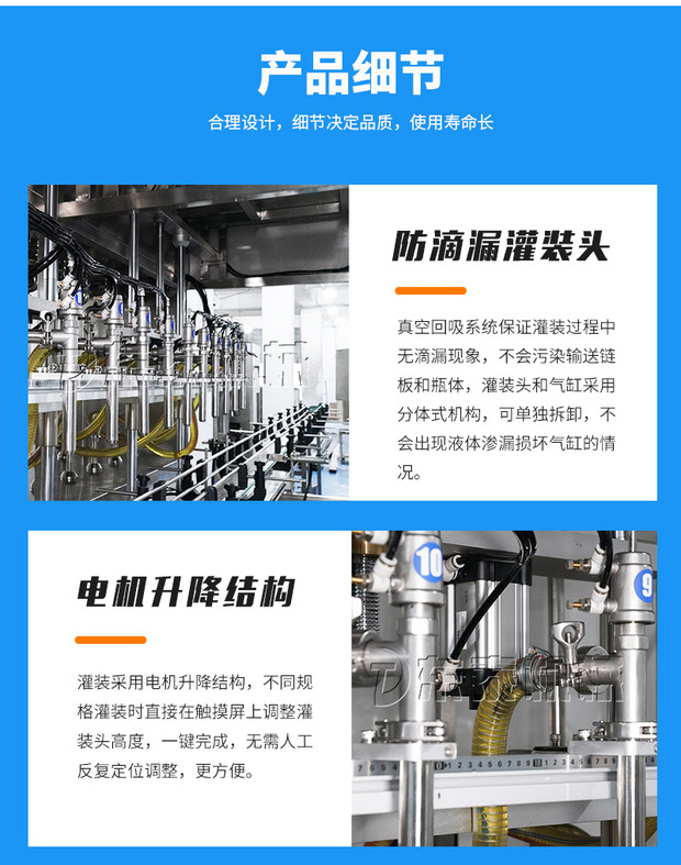 過(guò)程中無(wú)滴漏現(xiàn)象,不會(huì)污染輸送鏈板和瓶體,灌裝頭和氣缸采用分體式機(jī)構(gòu),可單獨(dú)拆卸,