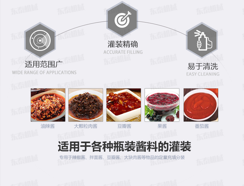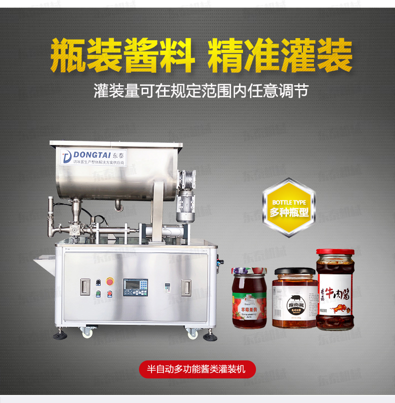 這款辣椒醬灌裝機是我公司結(jié)合自身十幾年的生產(chǎn)經(jīng)驗,加之灌裝機技術(shù),進(jìn)行設(shè)計的產(chǎn)品,其結(jié)構(gòu)更加簡單、操作更加簡便。小型辣椒醬灌裝機可灌裝顆粒漿狀流體物料,特別適用于調(diào)味品中帶顆粒并且濃度較大的辣椒醬、火鍋底料等粘稠醬類的灌裝,配置的自動攪拌器,保證了醬和油的充分混合,又稱為辣椒醬灌裝機、花生醬灌裝機、豆瓣醬灌裝機、果醬灌裝機,芝麻醬灌裝機、粘稠醬類灌裝機、牛肉醬灌裝機
