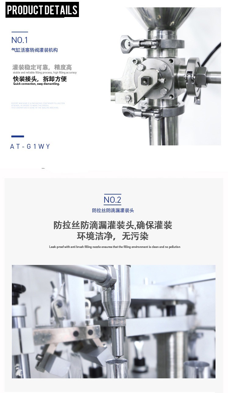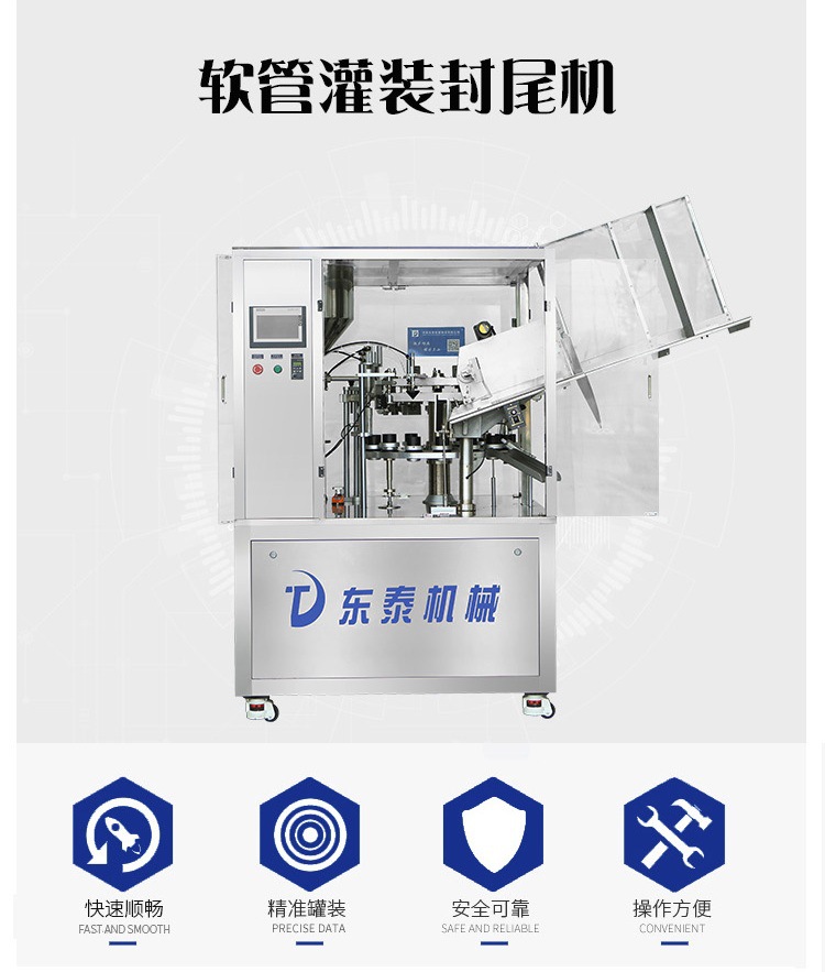 1.適用于醫(yī)藥、食品、化妝品、日用化工等行業(yè),對復合管,塑料管,鋁管進行灌裝封尾??蓪⒏鞣N糊狀、膏狀、粘度流體等物料順利準確地注入軟管中,并完成封尾和打批號、