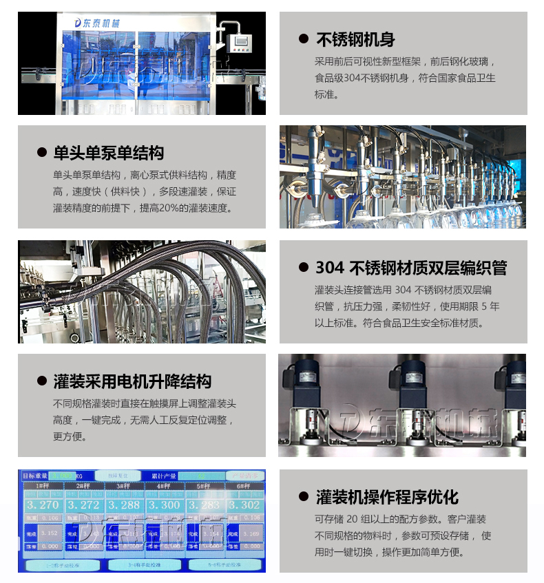 驅動方式更是通過伺服電機配合滾珠絲杠帶動相應料缸內的活塞做往復運動,從而讓料缸前腔產(chǎn)生負壓,以電機脈沖控制電機旋轉并控制活塞行程,從而調節(jié)灌裝量。驅動的方式應用于容積柱塞式灌裝方式,這種灌裝方式和物料接觸部分均為不銹鋼316L 材質,灌裝過程中無污染,各物料轉換清洗方便,車間灌裝結束設備維護清洗便捷,大大優(yōu)于自流其他灌裝方式。氣缸驅動相比伺服驅動針對灌裝的計量范圍更加廣泛靈活,針對客戶多種灌裝規(guī)格的需求服驅動方式調整方便,僅需在觸摸屏上設置即可,一般出廠可以根據(jù)客戶常用規(guī)格直接寫入程序。伺服驅動方式灌裝速度快,不受氣壓的影響,灌裝速度可控??傊核欧寗臃绞皆诓僮魇褂?、精度誤差、整機調整、設備清洗、維護保養(yǎng)等方面更加方便客戶使用。并且我們公司有著優(yōu)質的售后服務團隊為您以后的使用保駕護航。